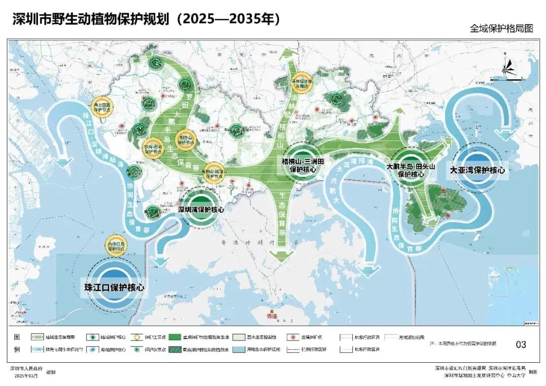 深圳生态基底兼具南亚热带生物多样性热点与超大城市空间复杂性,长期面临生境破碎化、生态孤岛化等挑战。规划以习近平总书记“山水林田湖”综合整治的生态思想为指导,以“三维生境网络”为统领,通过纵向山脉廊道贯通、横向陆海界面缝合、立体城市生境渗透,形成全域覆盖、功能复合的生态保护矩阵。
