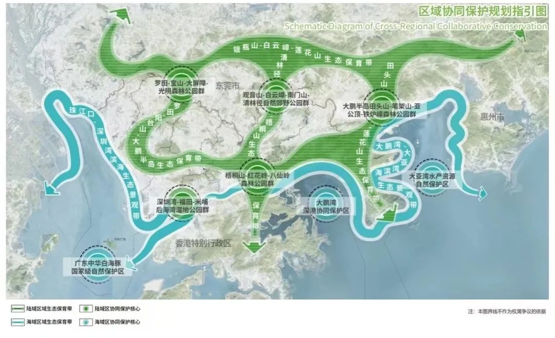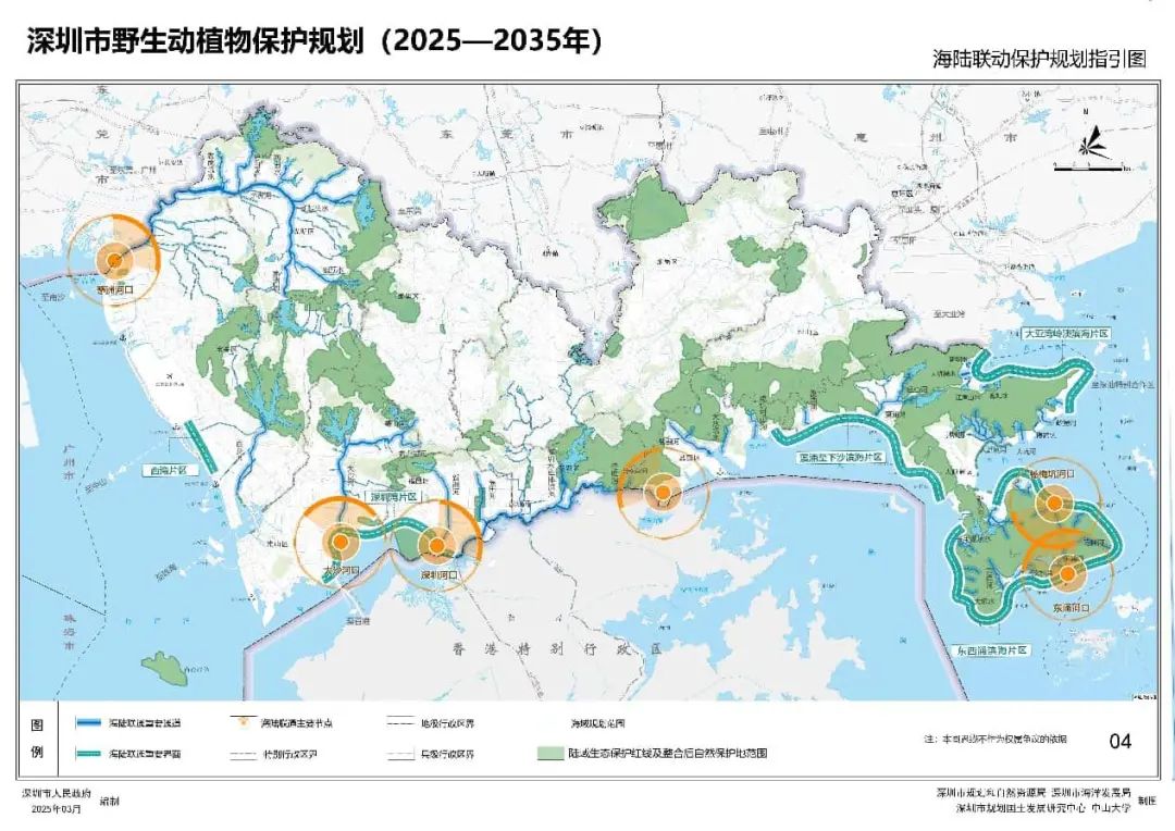 规划提出进一步深化粤港澳大湾区跨境生态治理,如深港协同打造“深圳湾—福田—米埔后海湾湿地公园群”,共同制定保护修复标准,共建黑脸琵鹭等目标物种的栖息地修复网络,共享环志数据与栖息地管理经验;修复梧桐山—红花岭动物迁徙廊道,促进小灵猫、赤麂等物种的种群交流等;联合修复罗田—宝山—大屏障等区域性生态廊道,实施穿山甲等濒危物种的种质资源联合保护执法;统筹珠江口中华白海豚保护,建立海洋生物数据共享平台,协同治理近海污染。