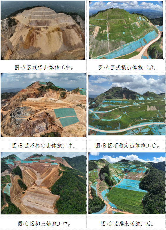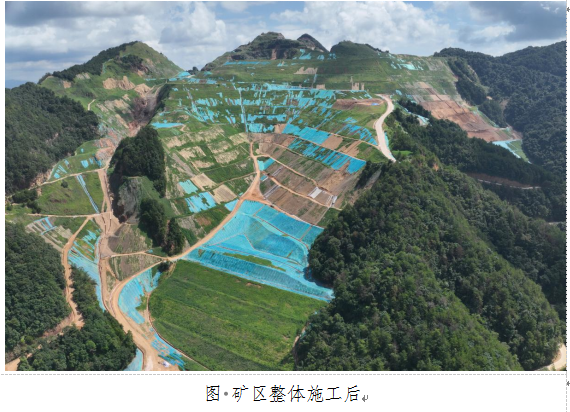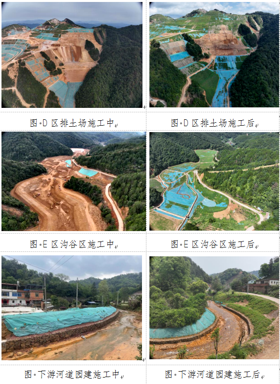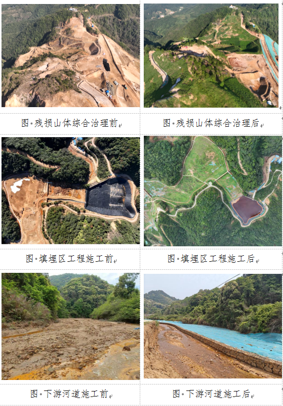 项目开展地质灾害治理、山体复绿、水土污染治理等关键工程,完成矿区治理修复面积超3600亩,残损山体综合治理超800亩,弃渣场土地整治超750亩,生态沟道修复425亩,重金属污染土壤处理2.5万立方米,土壤改良2.63万立方米,建成日处理量3000吨的污水处理站,完成下游村庄沿线70亩河道清淤、河床重建和17亩岸坡生态修复。