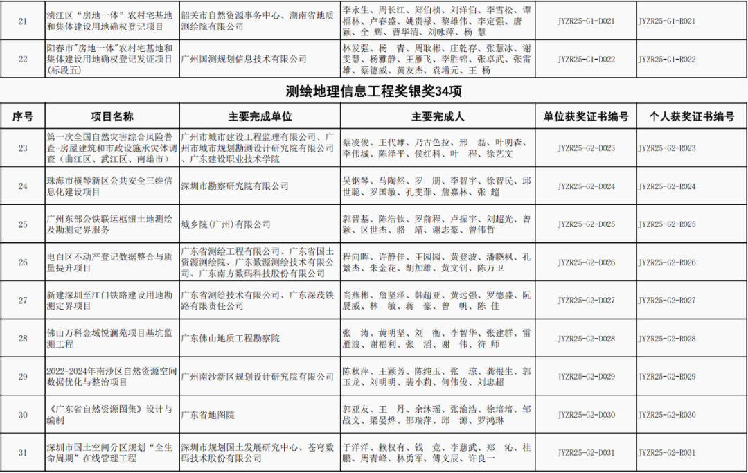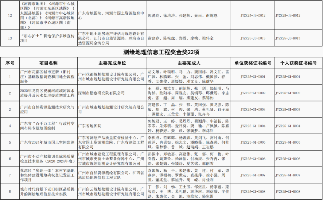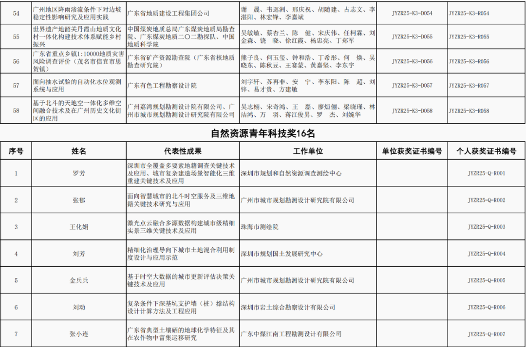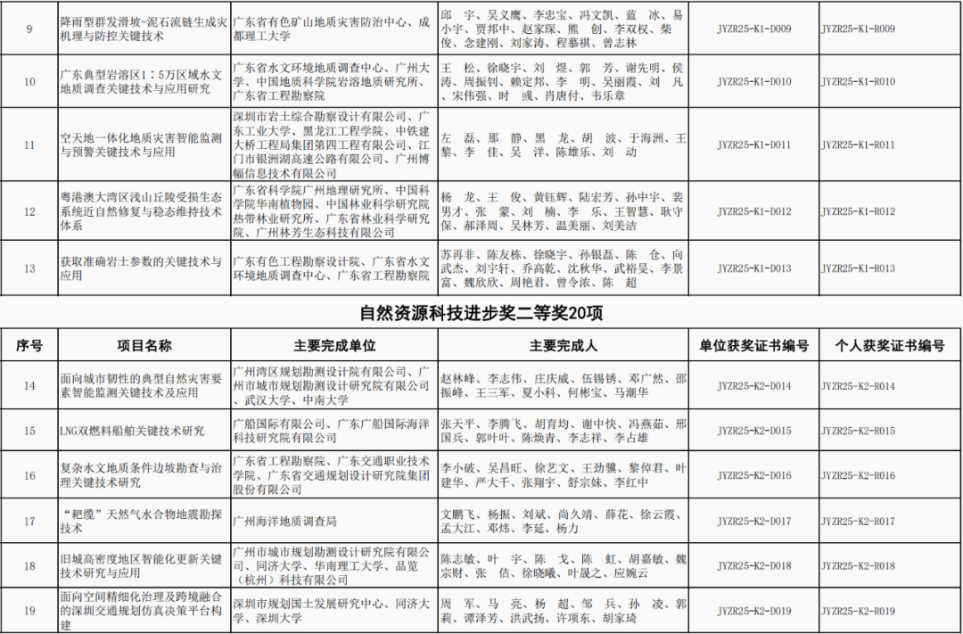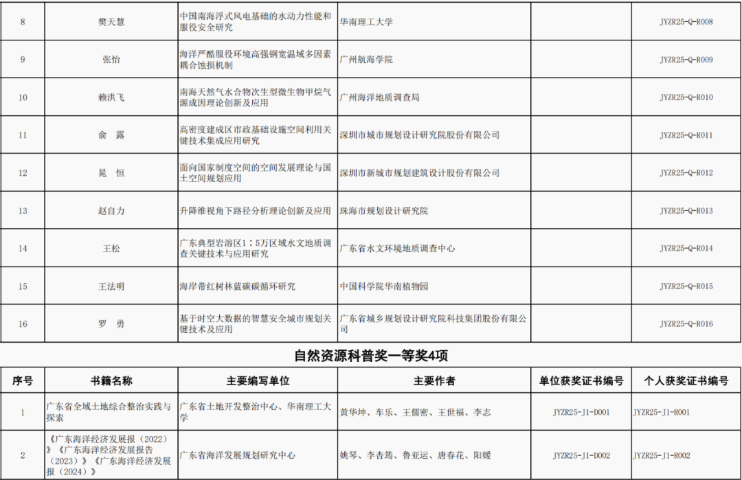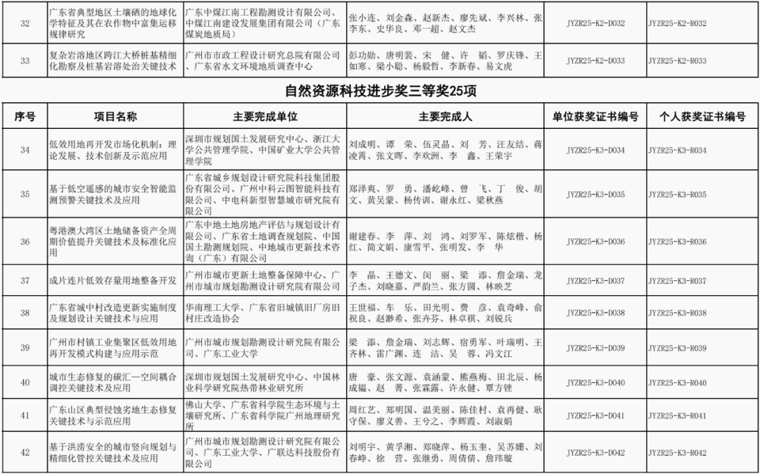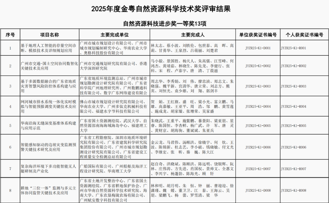 金粤自然资源科学技术奖励办公室根据《关于开展2025年度金粤自然资源科学技术奖评选的通知》(奖励办〔2025〕1号)、《金粤自然资源科学技术奖励办法》有关规定,对申报的141项自然资源科技进步奖、19项自然资源科普奖、39名自然资源青年科技奖、148项测绘地理信息工程奖、174项规划设计成果奖的项目(人选)进行严格审议,秉承客观、公平、公正的原则,推选出自然资源科技进步奖一等奖13项、二等奖20项、三等奖25项,自然资源科普奖一等奖4项、二等奖4项、三等奖5项,自然资源青年科技奖16名,测绘地理信息工程奖金奖22项、银奖34项、铜奖42项,规划设计成果奖金奖23项、银奖30项、铜奖47项。现将评审结果予以公布。
