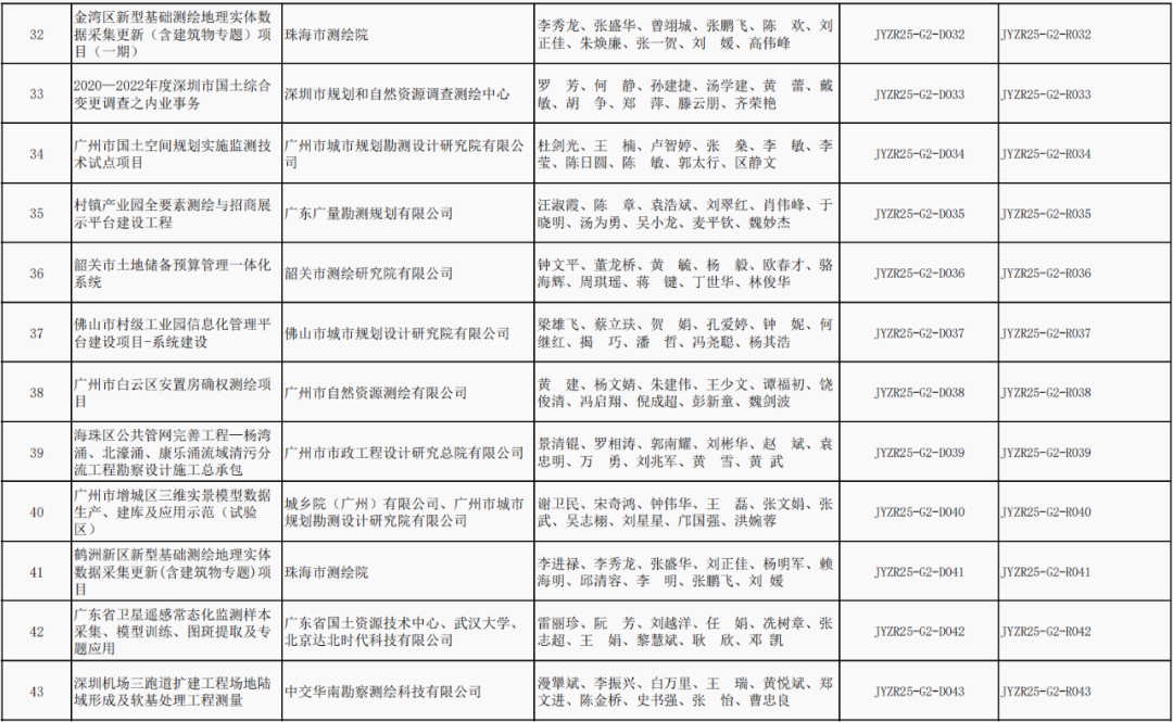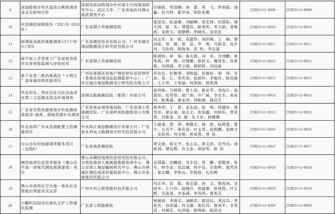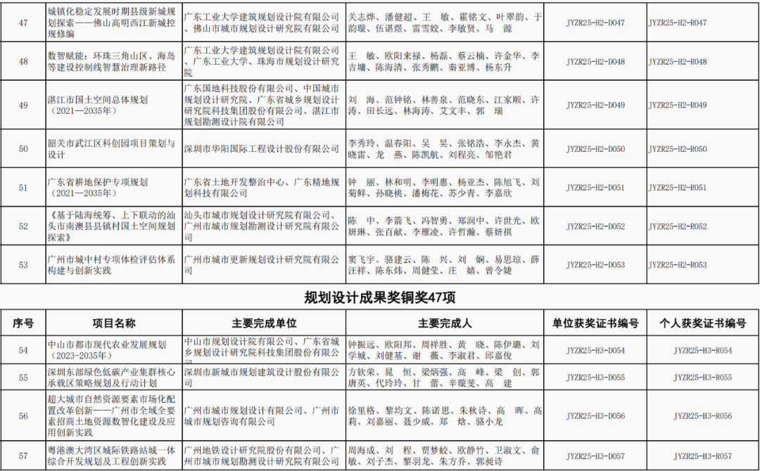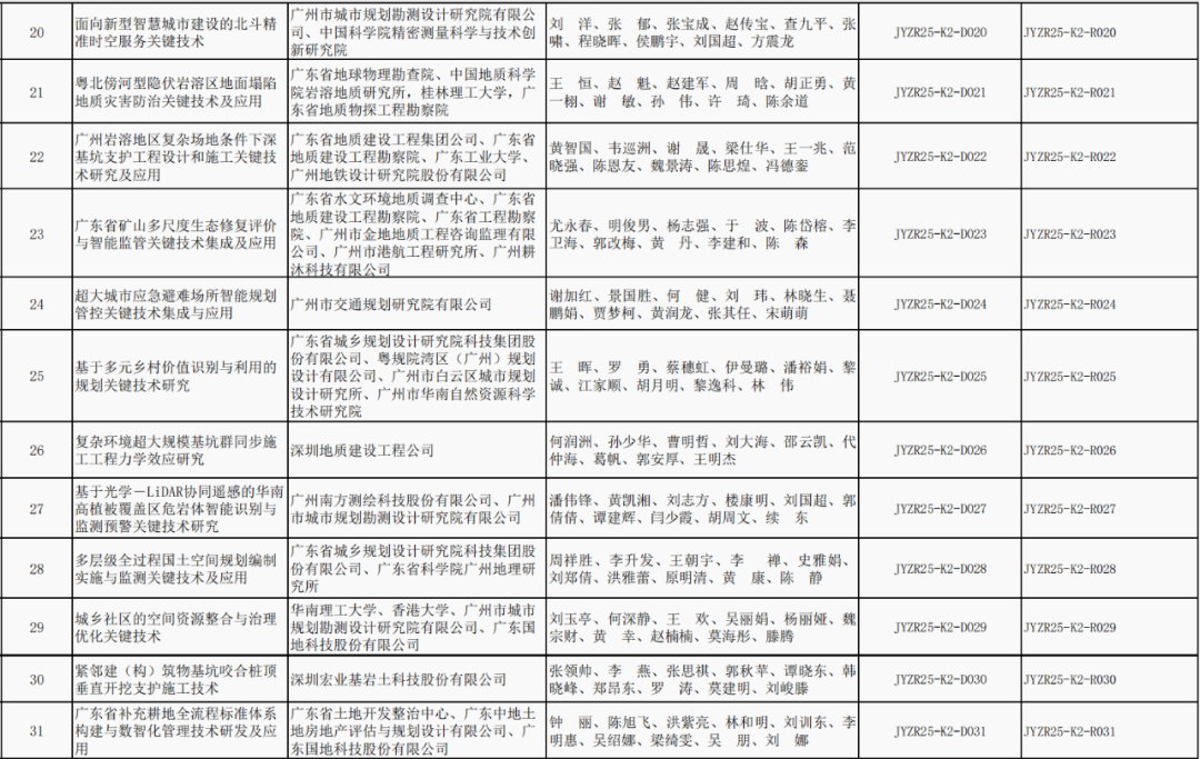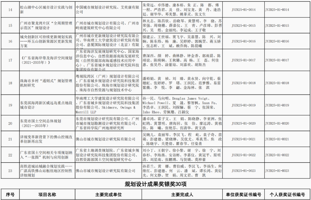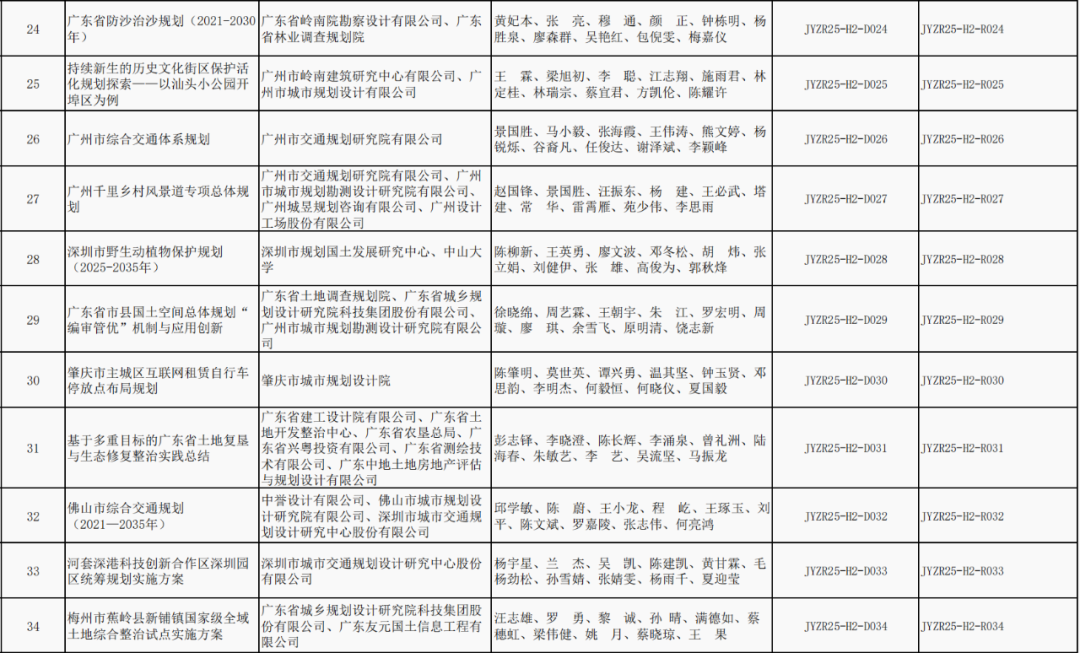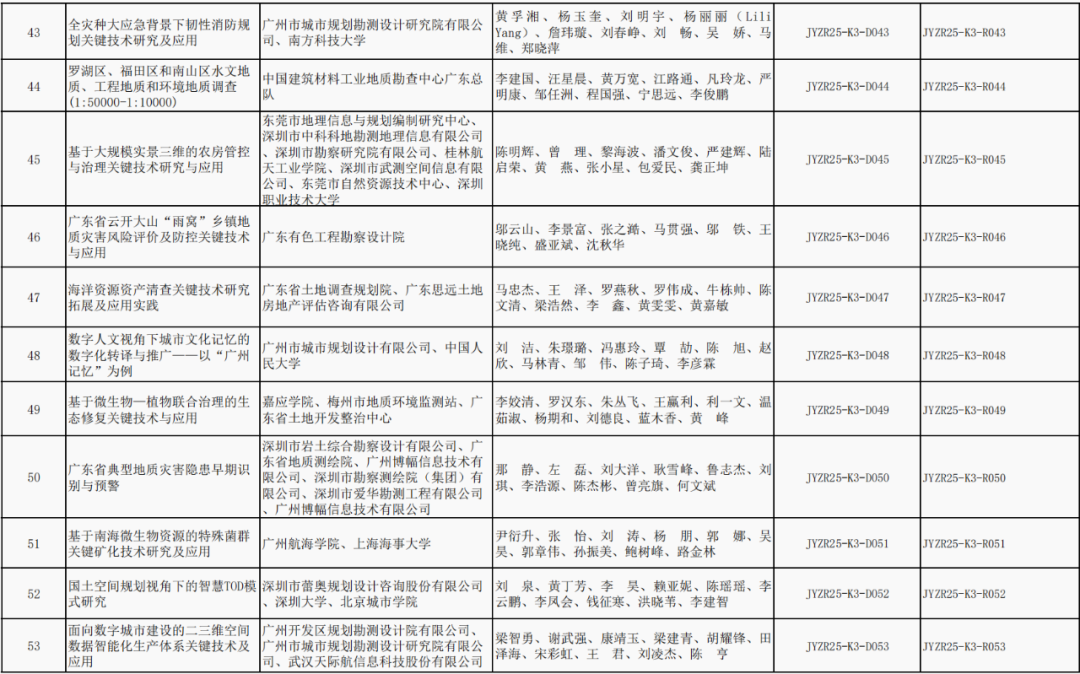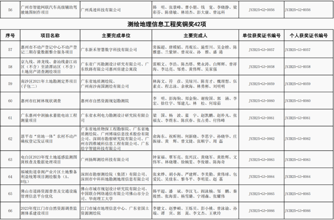 金粤自然资源科学技术奖励办公室根据《关于开展2025年度金粤自然资源科学技术奖评选的通知》(奖励办〔2025〕1号)、《金粤自然资源科学技术奖励办法》有关规定,对申报的141项自然资源科技进步奖、19项自然资源科普奖、39名自然资源青年科技奖、148项测绘地理信息工程奖、174项规划设计成果奖的项目(人选)进行严格审议,秉承客观、公平、公正的原则,推选出自然资源科技进步奖一等奖13项、二等奖20项、三等奖25项,自然资源科普奖一等奖4项、二等奖4项、三等奖5项,自然资源青年科技奖16名,测绘地理信息工程奖金奖22项、银奖34项、铜奖42项,规划设计成果奖金奖23项、银奖30项、铜奖47项。现将评审结果予以公布。