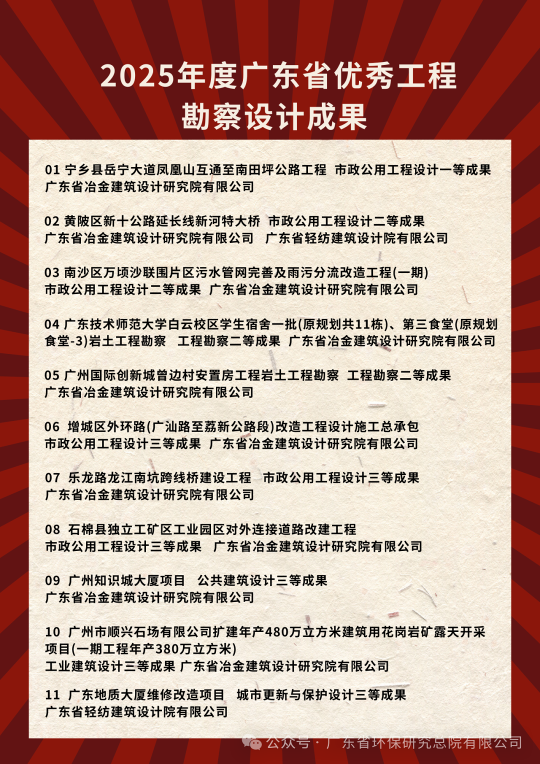7月15日,2025年度广东省优秀工程勘察设计成果评定结果公布了,我协会常务副会长单位广东省环保集团有限公司子公司广东省环保研究总院有限公司下属省冶金院、省轻纺院共计11个项目上榜,其中一等成果1个、二等成果4个、三等成果6个。