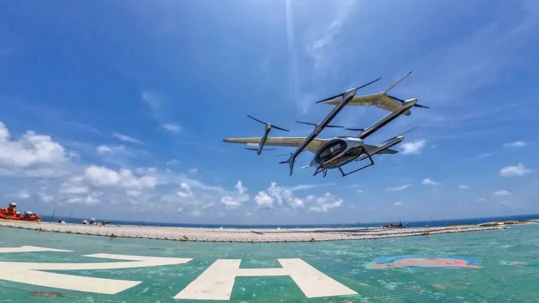 深圳出台全国首个低空航空器起降设施布局市级专项规划。图为我国自主研发的吨级eVTOL“凯瑞鸥”。图源:中国海油深圳分公司